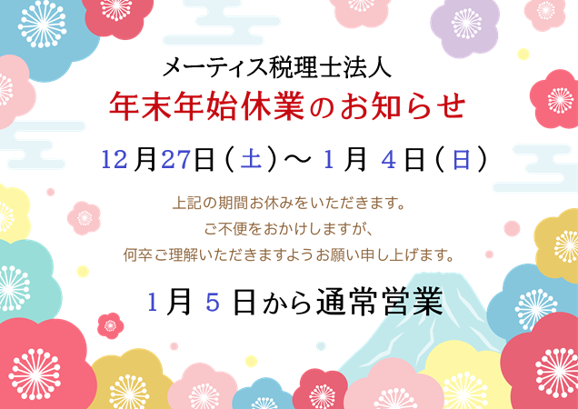 メーティス税理士法人より 年末年始の営業日についてご案内いたします。